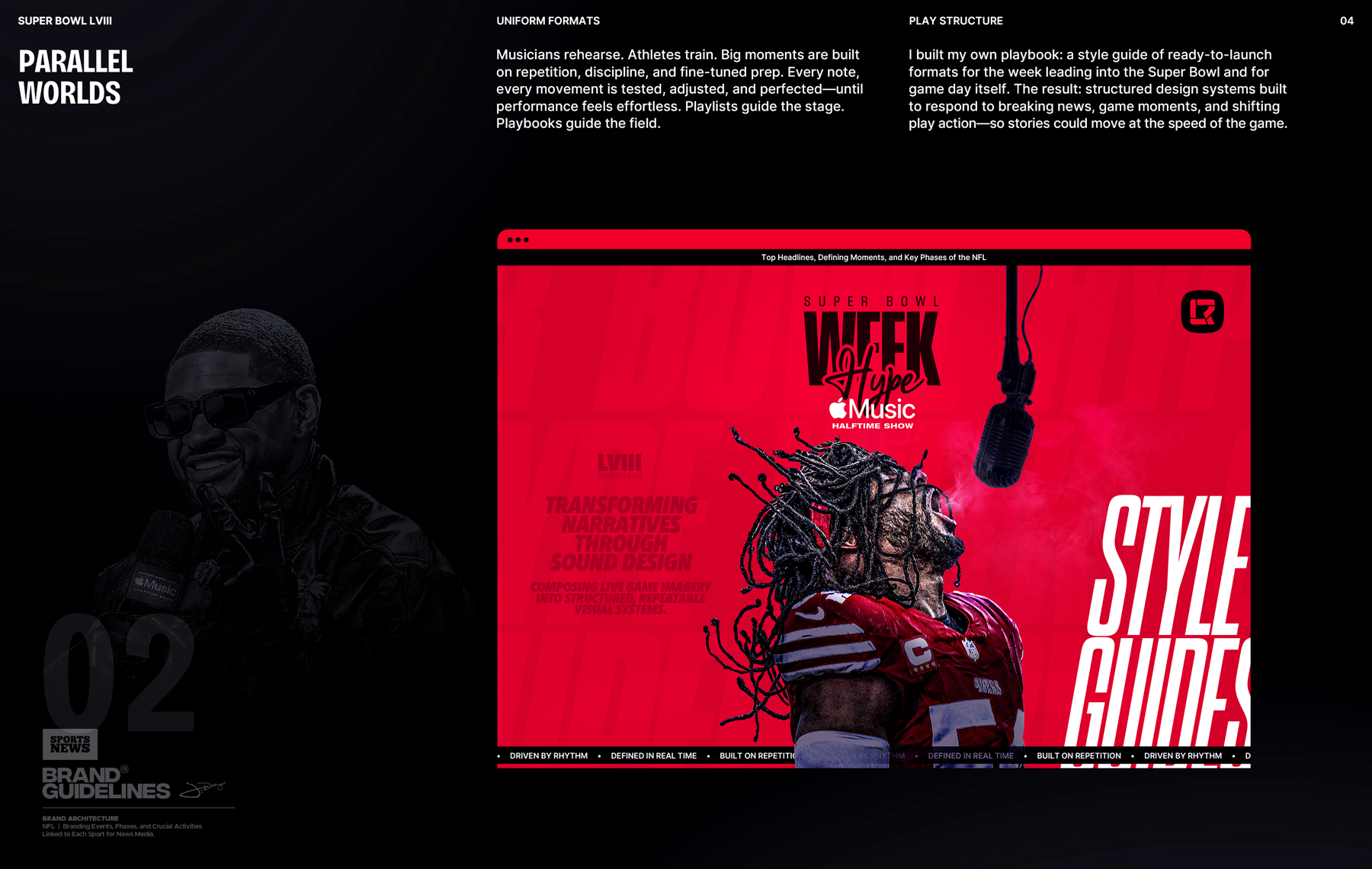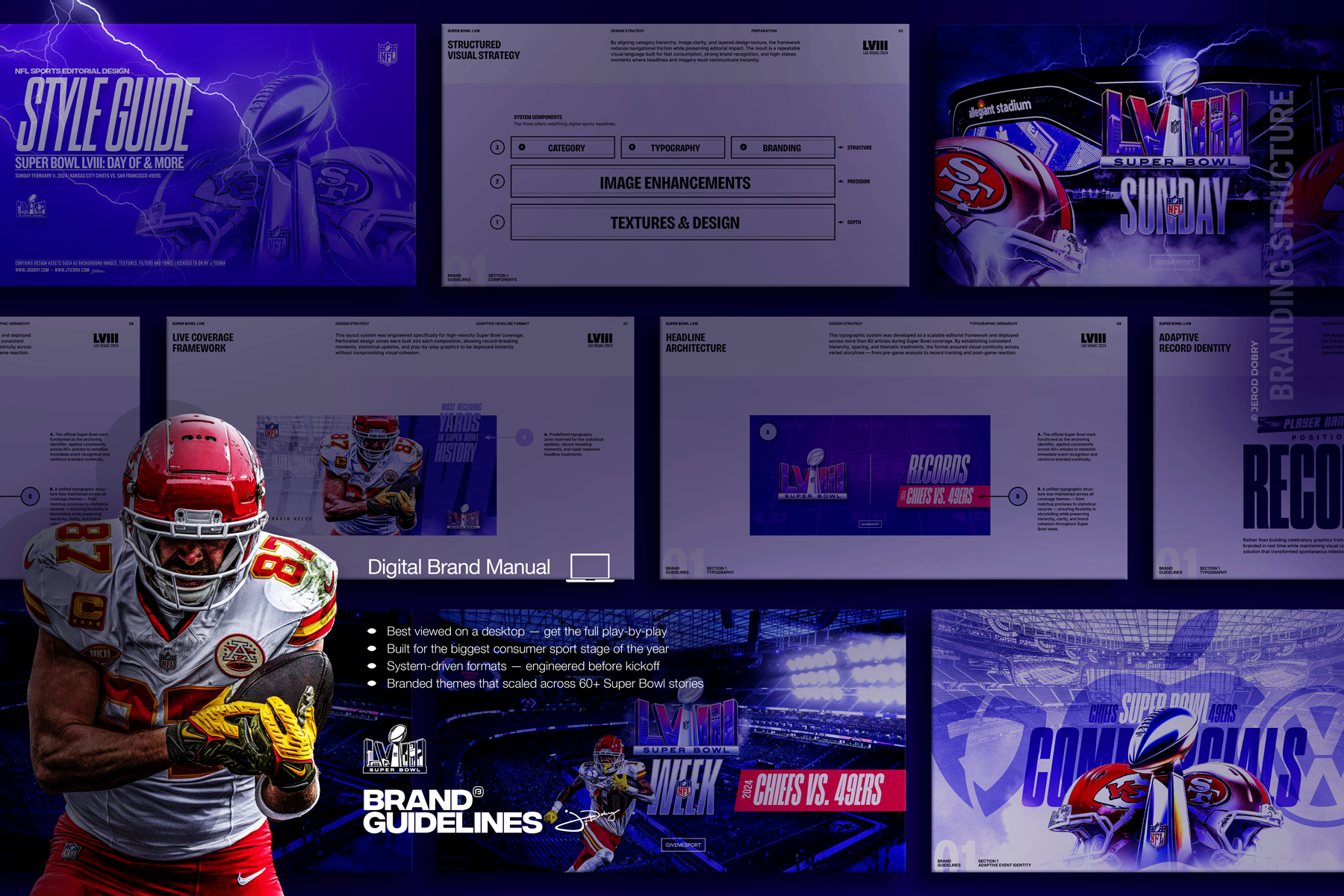 A win isn’t about replaying every snap—it’s about executing the key moments. With that mindset, I developed the essential assets that launched and closed out Super Bowl coverage, orchestrating distinct design themes for the event itself and the week leading up to it. The approach wasn’t reactive; it reflected the larger system I built in advance of the game.