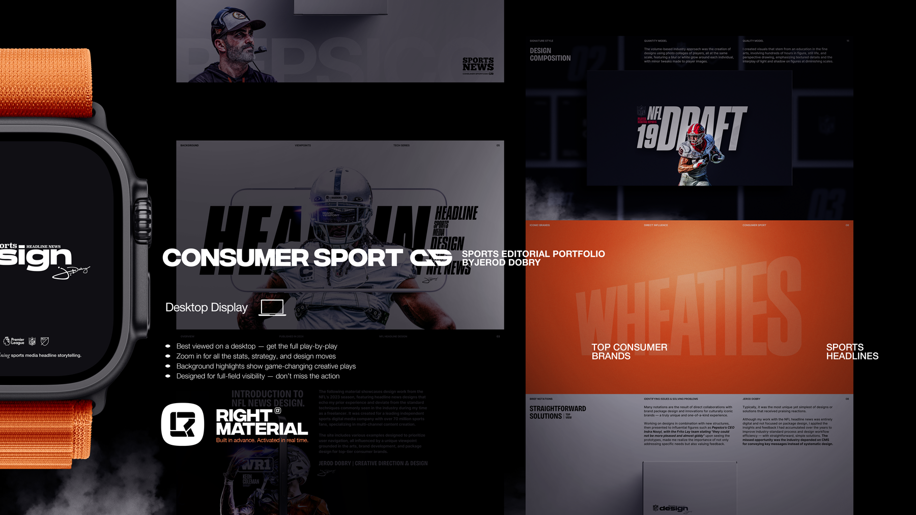 Beyond foreground category branding, additional solutions focused on strengthening recognition through restraint—using structure, typography, and color to guide navigation without overwhelming the subject. The first portfolio chapter explores Draft Scouting Reports, where simplified background identity replaced industry clutter, allowing the athlete to stand out.