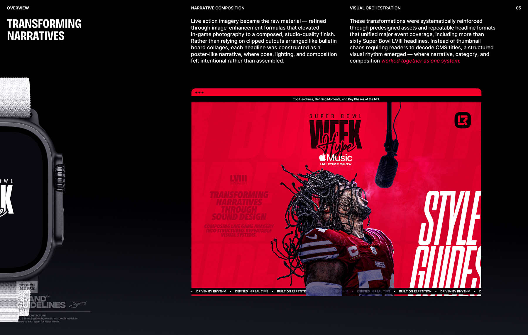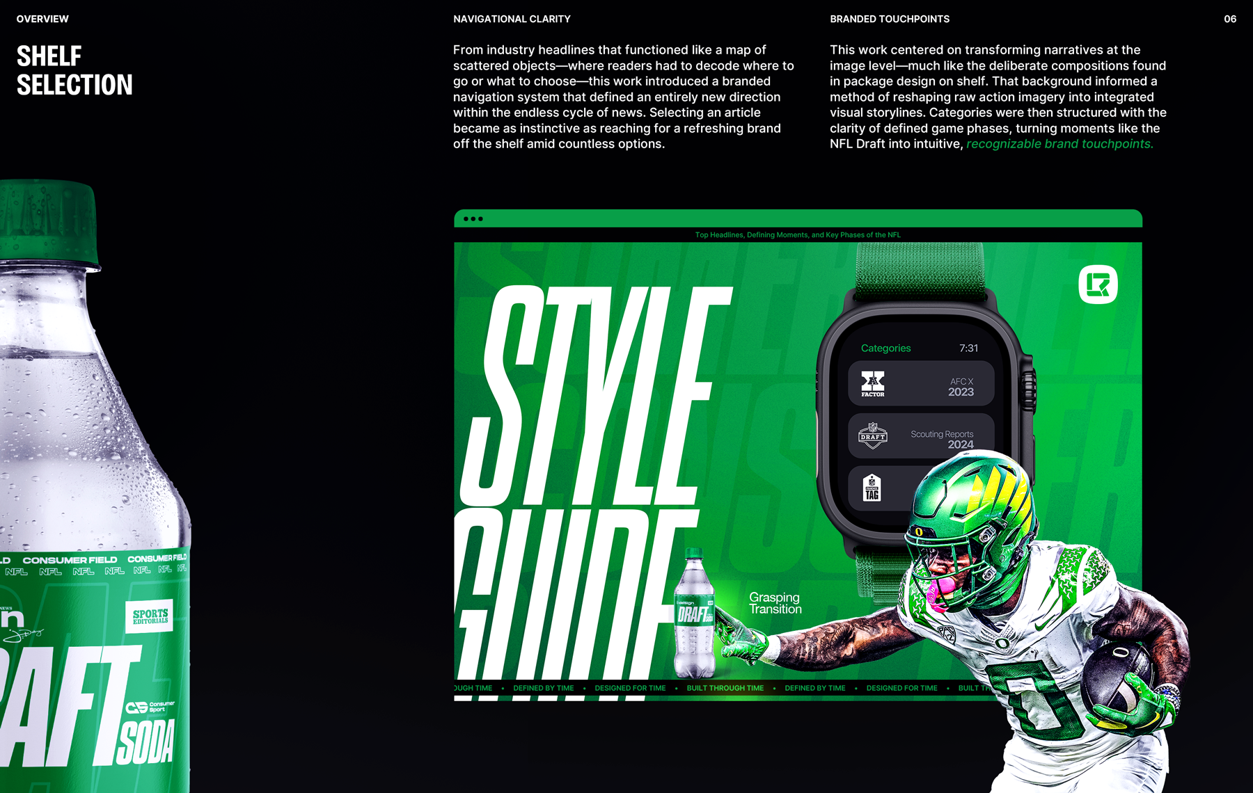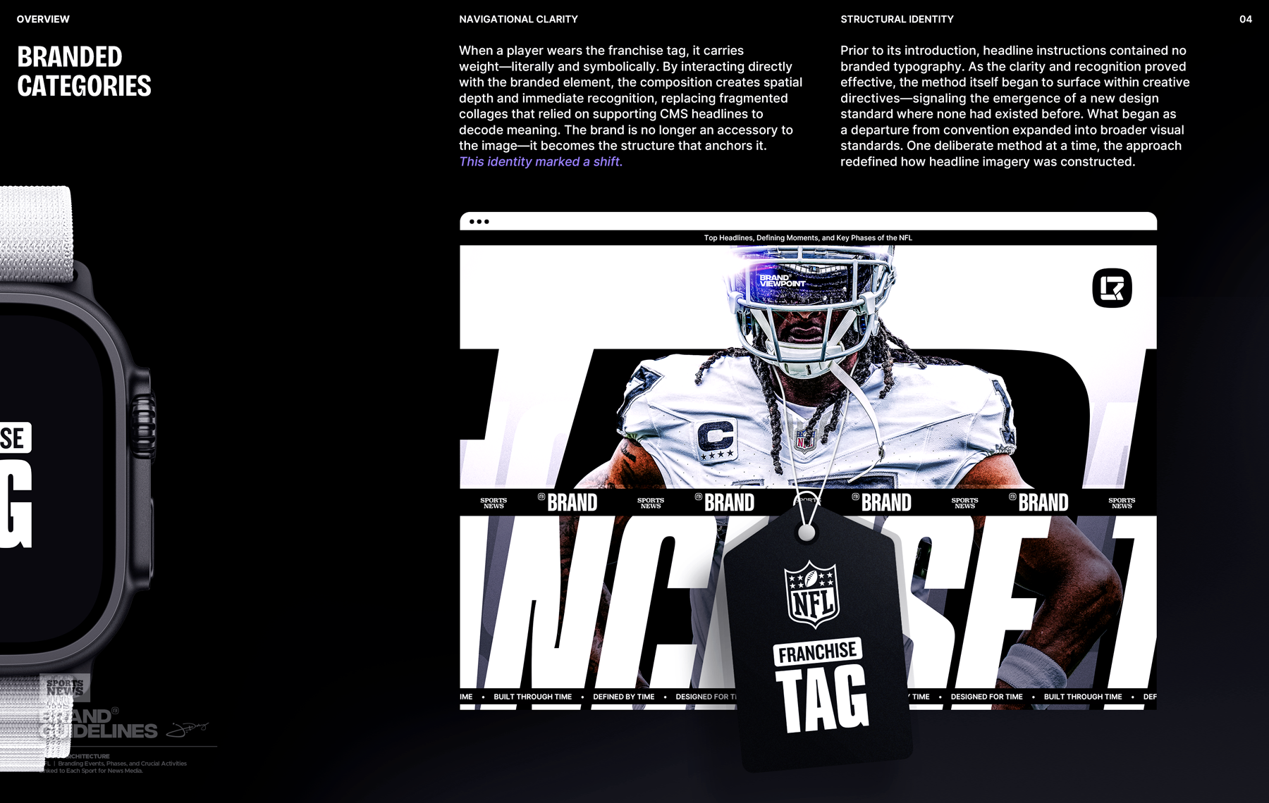 Football revolves around time—and so does headline sports news. In an environment driven by urgency, one-off designs were created on the spot. I introduced structure to the chaos: rapid, prepared systems paired with narrative frameworks rooted in the discipline of iconic consumer brands—guiding readers through branded headline categories just as an article moves a reader through a story.